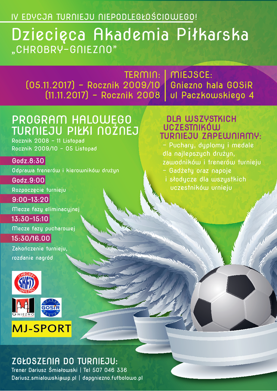 5 I 11 listopada w hali GOSiR przy ul. Paczkowskiego odbędzie się halowy turniej piłki nożnej: IV Niepodległościowy Turniej Piłki Nożnej -organizator Chrobry Gniezno.