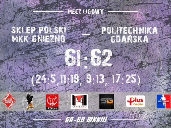 Pierwsza kwarta wygrana przez MKK 24:5, druga kwarta prowadzi SKLEP POLSKI MKK GNIEZNO 35-24 …. W trzeciej kwarcie meczu MKK nadal prowadzi w tym spotkaniu…ale nie wiadomo, co się stało, że ostatecznie przegrywamy z Politechniką Gdańską 61:61.