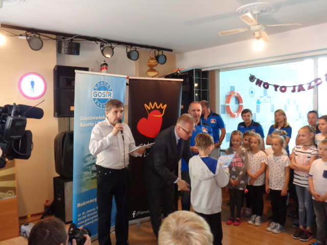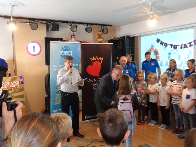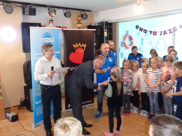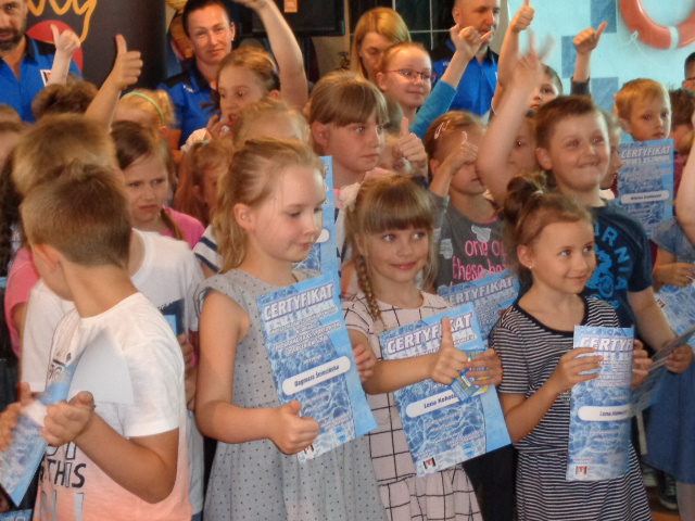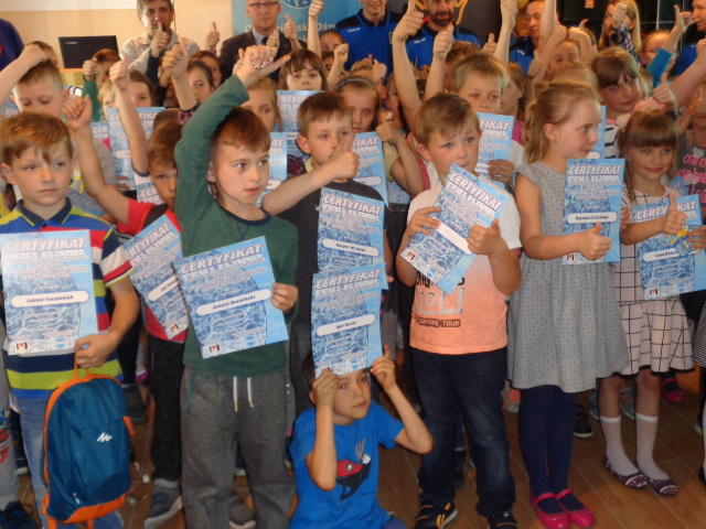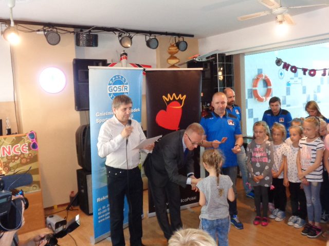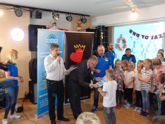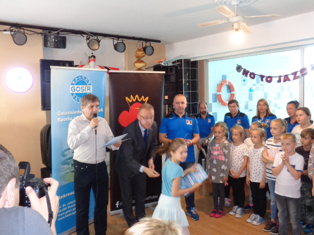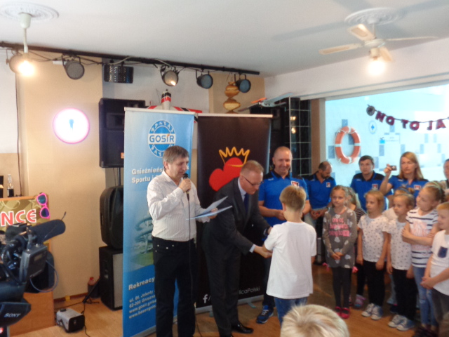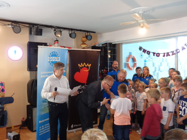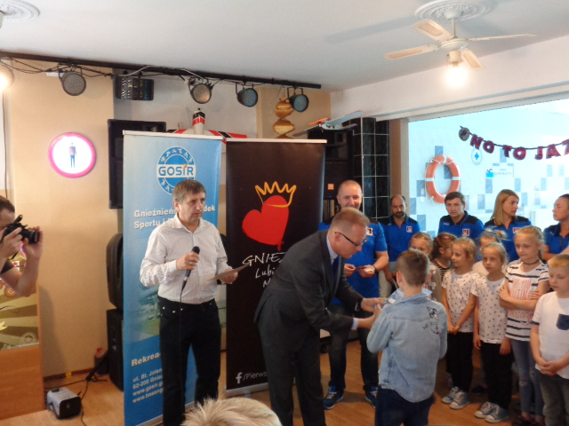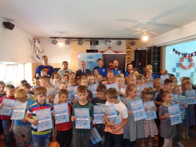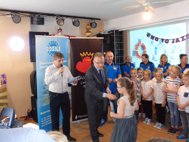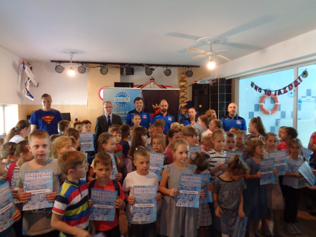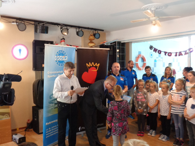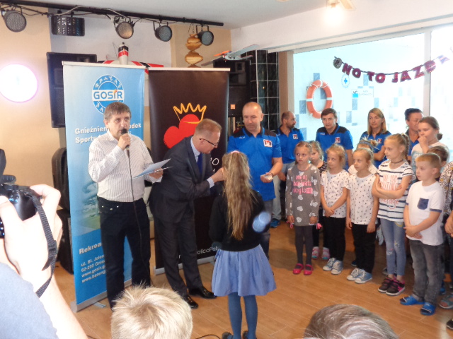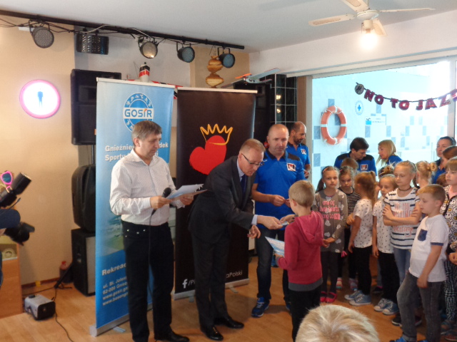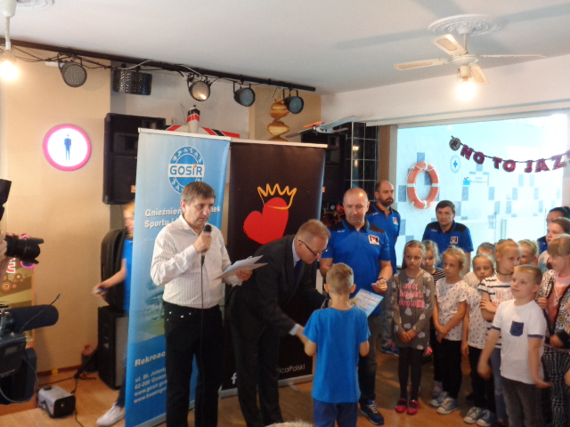 Każdy uczestnik kursu na zakończenie edycji otrzymał pamiątkowy dyplom - certyfikat i dwa bilety na basen. Wręczał je dzieciom Michała Powałowski - zastępca Prezydenta Miasta Gniezna, wspólnie z Markiem Szczepanowskim- Inspektorem Zespołu ds. Sportu w UM , oraz Waldemarem Siwką - szefem Służba Ratowniczych GOSiR.