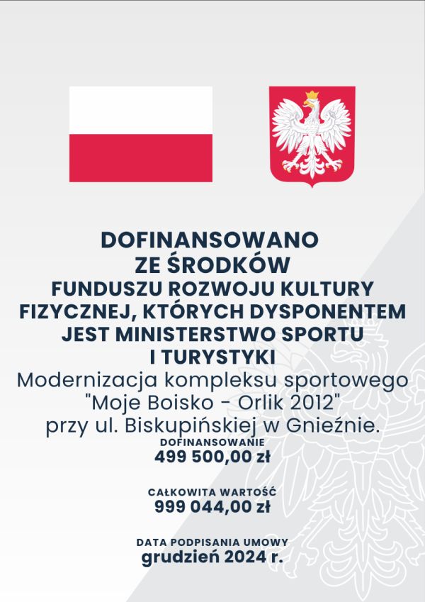 Modernizację kompleksu sportowego "Moje Boisko - Orlik 2012" przy ul.Biskupińskiej w Gnieźnie dofinansowano ze środków Funduszu Rozwoju Kultury Fizycznej, których dysponentem jest Minister Sportu i Turystyki.