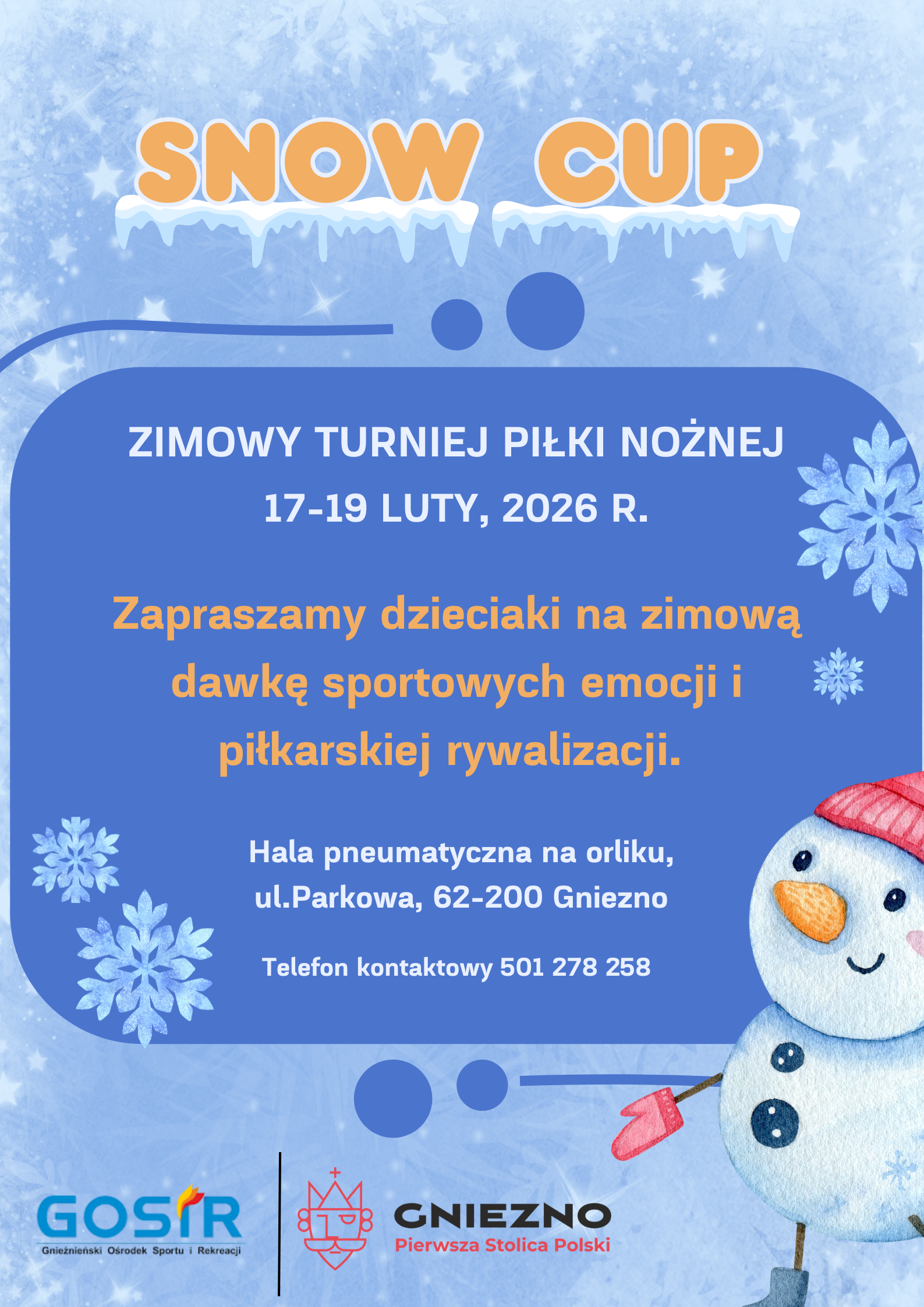 Zapraszamy chętnych chłopców w wieku od 12 do 17 lat do udziału w Zimowym Turnieju Piłki Nożnej podczas ferii zimowych - Snow Cup
