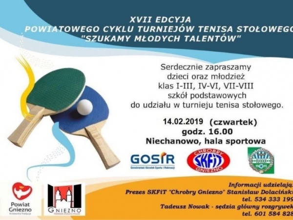 Do udziału w Otwartym Turnieju Tenisa Stołowego „Szukamy Młodych Talentów” zapraszamy dzieci i młodzież szkół podstawowych z terenu gmin powiatu gnieźnieńskiego.