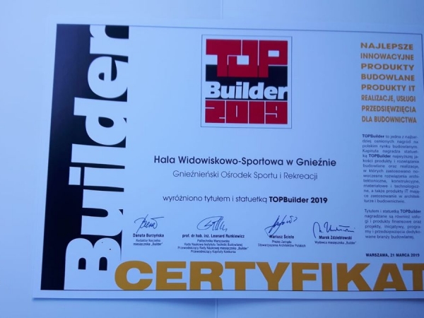 21 marca 2019 roku w Warszawie w siedzibie Stowarzyszenia Architektów RP odbyła się Gala TopBuilder 2019, na której rozdano statuetki TopBuilder 2019. Nagrodę otrzymała również Hala Widowiskowo-Sportowa im. Mieczysława Łopatki w Gnieźnie jestesmy z tego bardzo dumni...