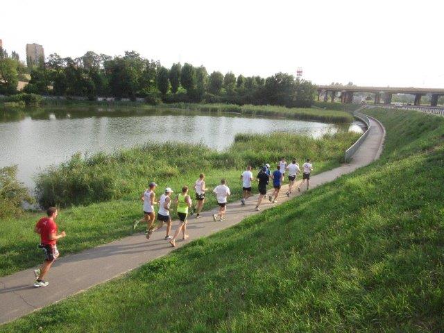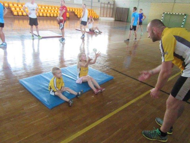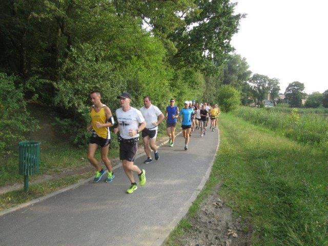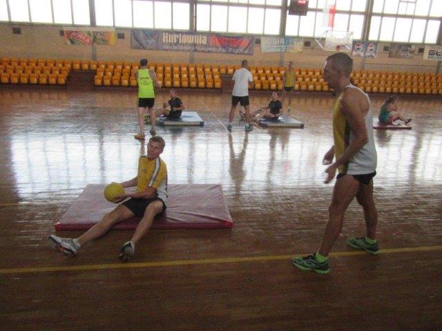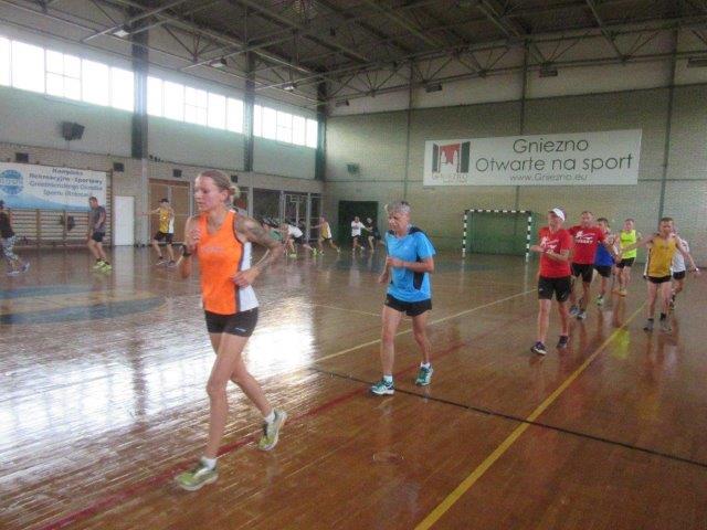 Chcąc rozwijać się biegowo nie wystarczy tylko biegać. Tak samo jak bieganie ważny jest odpoczynek oraz dbanie o swoją ogólna sprawność fizyczną. Należy pamiętać, że mięśnie mało elastyczne, słabo rozciągnięte w połączeniu ze zmęczeniem, szybciej ulegają mikro i makro urazą. Mięsień zmęczony będzie bronił się przed rozciąganiem raptownie kurcząc się co może doprowadzić do naderwania włókienek mięśniowych. Dlatego Klaudiusz i Andrzej zachęcali uczestników treningu do zwracania uwagi nie tylko na przebiegnięte kilometry ale również do regularnego ćwiczenia wszystkich partii mięśniowych, ze szczególnym naciskiem na mięśnie brzucha i mięśnie grzbietu. I taki przykładowy trening ogólnorozwojowy przeprowadzili w hali GOSiR (gdzie można było schować się przed palącym słońcem). W pierwszej części przeprowadzono Zaprawę LA (gimnastyka w truchcie) a w drugiej trening z piłkami lekarskimi.