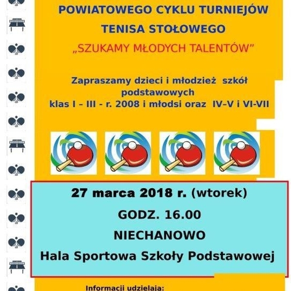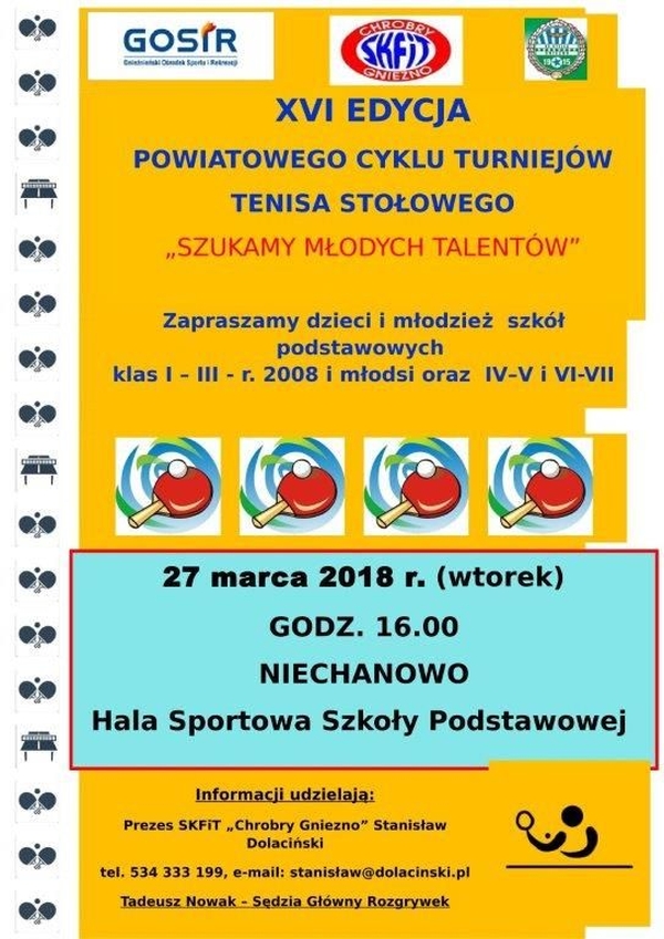 Zawodniczki i zawodnicy rywalizować będą w kategorii klas I-III rocznik 2008 i młodsi, klas IV-V i klas VI-VII o pamiątkowe medale i cenne punkty w klasyfikacji generalnej oraz o puchary dla 3 najlepszych szkół ufundowane przez Wójta Gminy Niechanowo pana Eugeniusza Zamiar. Impreza organizowana będzie wspólnie z Klubem Sportowym Stella Gniezno, GOSiR, Wójtem Gminy Niechanowo oraz Urzędem Miejskim i Starostwem Powiatowym w Gnieźnie. Młodych adeptów tenisa stołowego serdecznie zapraszam do udziału w rozgrywkach.
