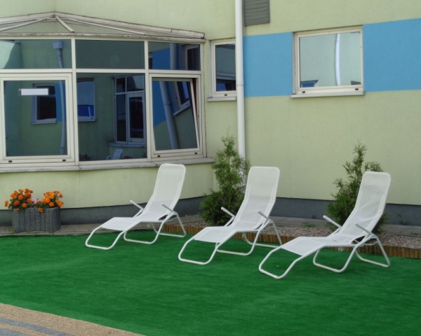 Na zielonej trawce i wygodnych leżakach odpocząć i zrelaksować się można po wodnych szaleństwach w basenie, wysiłku w saunie, czy na siłowni.